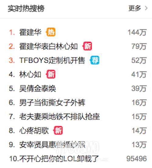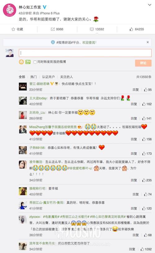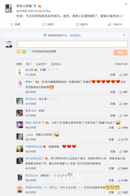 然后早上还被陈晓陈妍希领证刷屏的微博瞬间就被霍建华和林心如的婚讯刷屏,今天的喜事真的是一波接一波啊。当然啦,胡歌的微博在刘诗诗大婚、袁弘大婚之后再一次被沦陷,不知道什么时候老胡也像好友一样公布恋情啊。