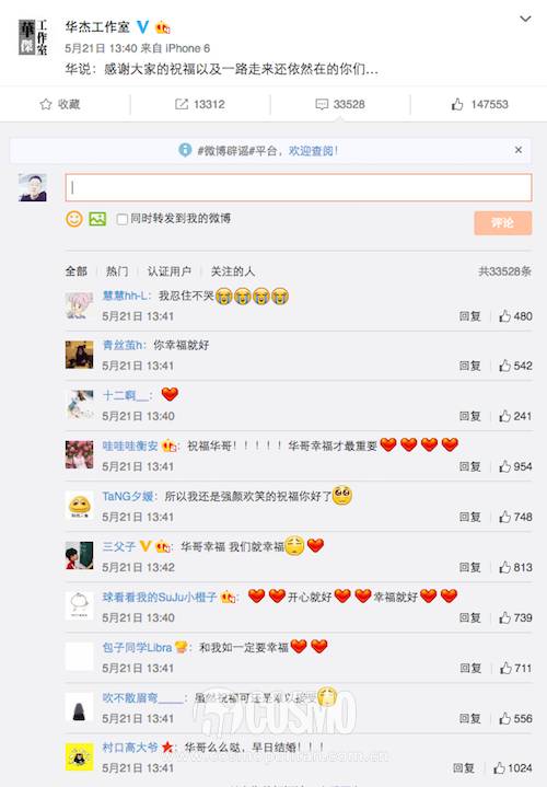 感觉两人真的是很有默契,又是在COCO吃午饭的时候宣布恋情,开始以为是玩笑,后来看到官方发出的声明才是真的很激动啊。现在微博下面的留言也肉眼可见的速度增加着,大家也是纷纷送上了祝福。