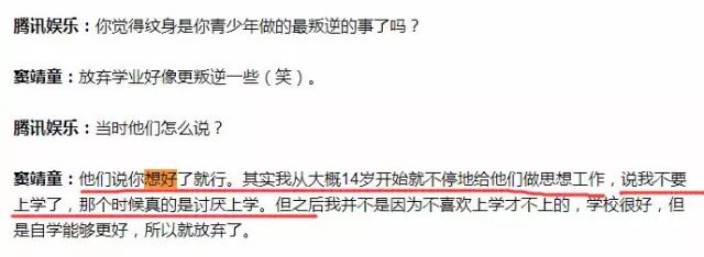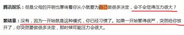 在这种教育方式下长大的孩子,一个最典型的就是窦靖童了,前段时间她接受腾讯娱乐采访时提到,她和王菲之间的相处准则就是平等和尊重,家庭成员不管年龄大小,大家都是平等交流决定事情的。窦靖童在第一次纹身的时候去问父母意见,得到的回复是不后悔就行。后来她两次辍学,家里也并没有气急败坏,而是让她自己想好了再决定。