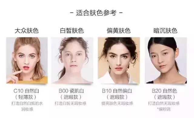 这款粉底液色号一共有4个色号,分别是C10、B00、B10、B20,担心仙女们不知道该如何选择,所以就直接分三个维度区分给各位仙女啦!