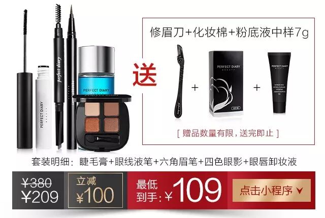 相当于109元可以获得睫毛膏、四色眼影、眼线液笔、眉笔、眼唇卸妆液、修眉刀粉底液中样(7g)和化妆棉。