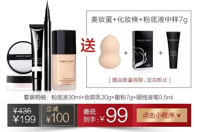 相当于99元可以获得粉底液、妆前乳、散粉、眼线液笔、美妆蛋、粉底液中样(7g)和化妆棉。