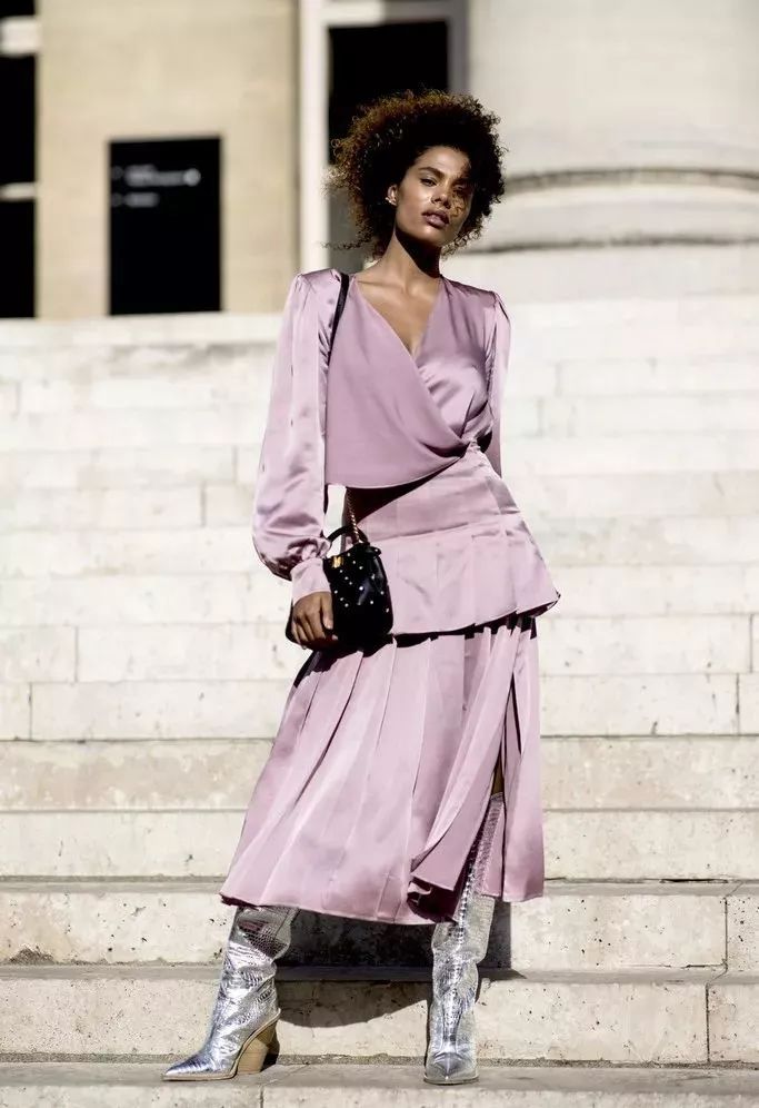 时尚博主Zina Charkoplia大号的灰色Peekaboo搭配这件淡雅的不规则下摆连衣裙,精致内敛又充满女人味。