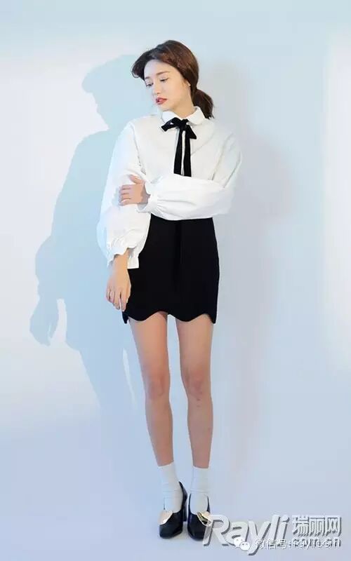 蝴蝶结系带白色圆领衬衫搭配黑色波浪花边半身短裙。