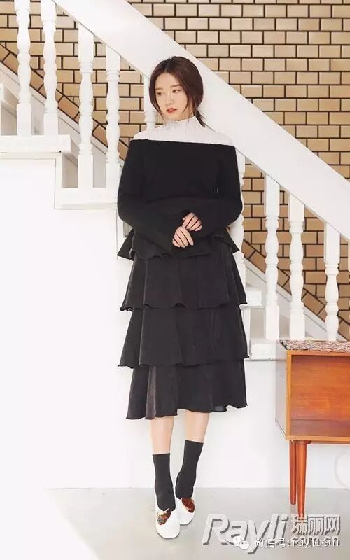 白色小高领打底衫搭配黑色一字领蛋糕裙。