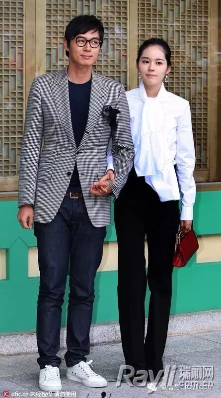 延政勋、韩佳人夫妻两人以经典黑白灰色调和谐出镜。2年前韩佳人系带白衬衣+阔腿裤的穿法放在今天也不过时。