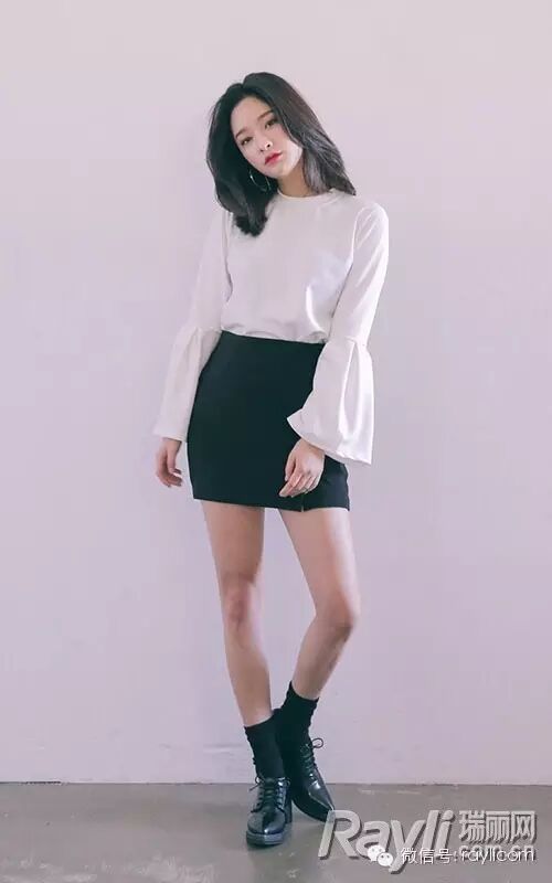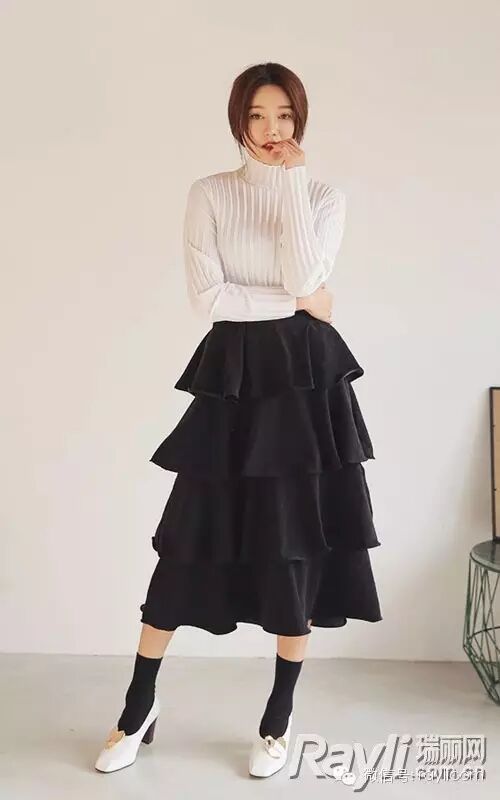 白色风琴褶半高领上衣搭配黑色半身蛋糕裙。。