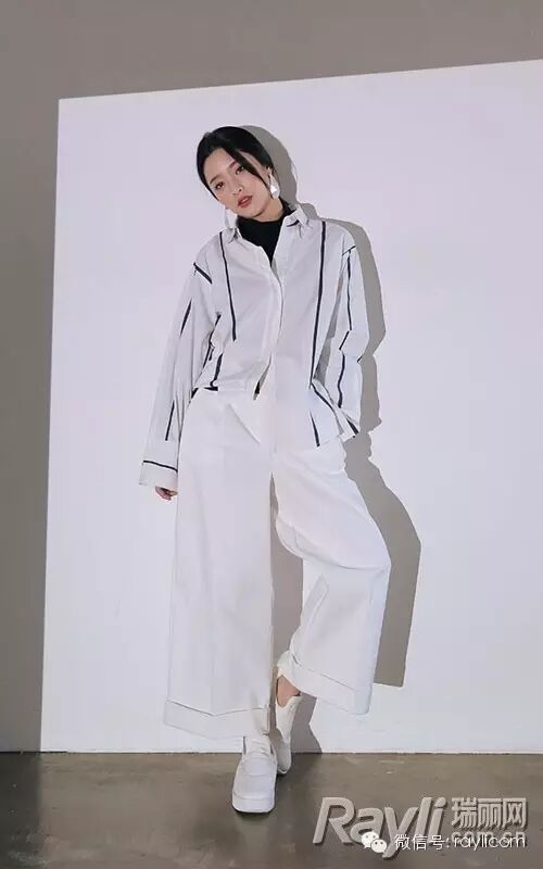 黑白竖条纹衬衫搭配黑色高领上衣和白色阔腿裤。