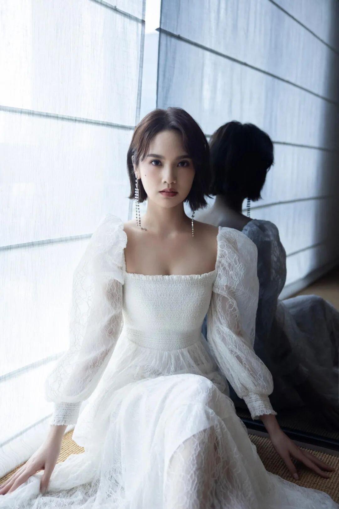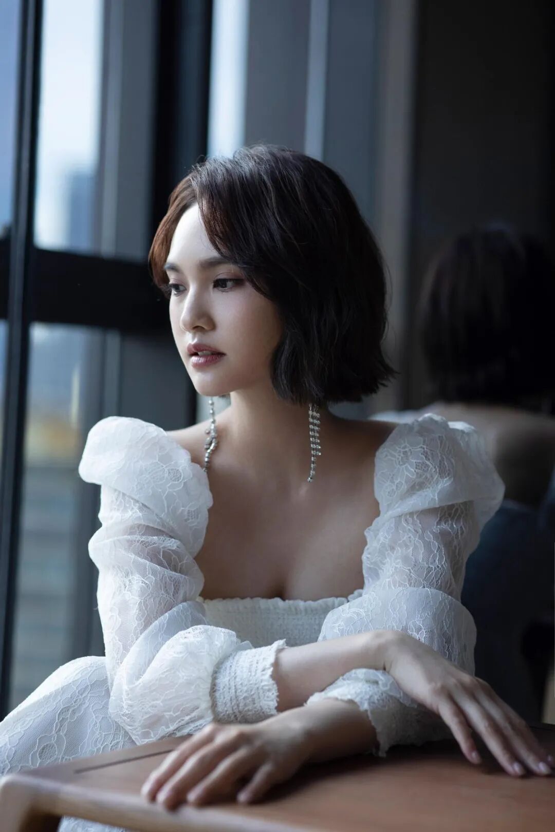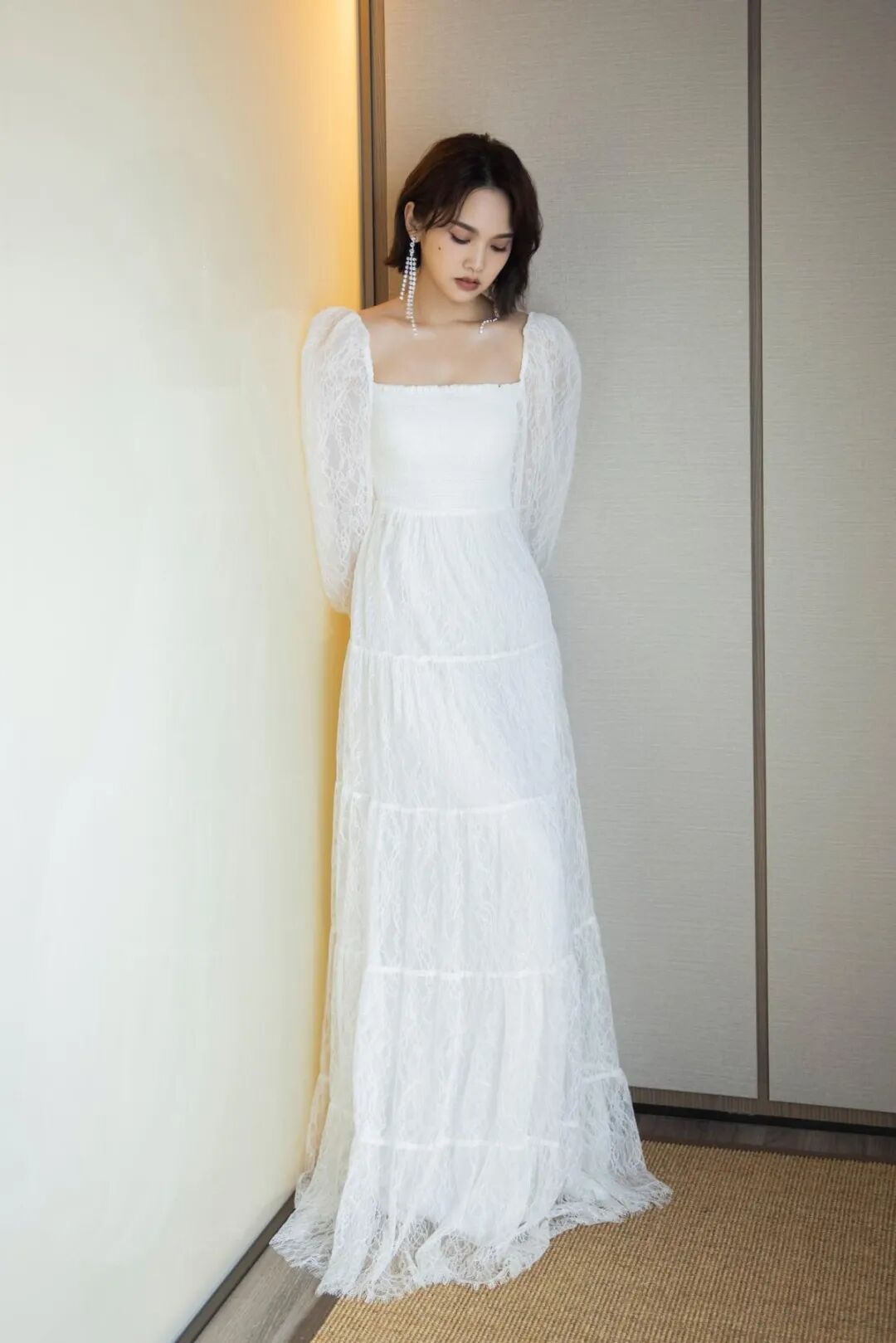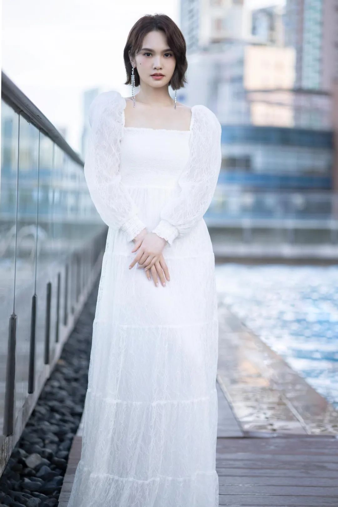 长款白色连衣裙最能展现穿搭者仙气飘飘的气质,同时选用薄纱材质更能增加轻盈灵动的淑女感,裙摆虽然没有强烈的视觉冲击感,但是利用拼接感与褶皱的桶状裙摆也展现了与众不同的视觉感受,而这件白色长裙最大的亮点在于方领与灯笼袖,微微露肤不但保留少女感又增加性感,才是整体穿搭纯欲风的来源,让这条白色连衣裙可以与其他白裙区别。长款耳饰刚好到锁骨,增强了高级大气的骨感,细长款更适合杨丞琳的圆脸,同时与齐耳短发相得益彰。