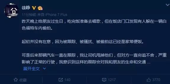 对于这种事,涛哥没什么想多说的。本来嘛,狗仔和娱乐明星本身就有一种“既对立又共生”的畸形关系,对立是因为狗仔极有可能随时侵犯到明星们的私人空间,就像徐峥微博说的那样:“遭遇不明来由的刻意跟踪,从而心生恐惧”;而共生则是因为狗仔也是增大明星曝光量的一种特殊渠道,就像那位“记者”说的:“有时候我们也会有合作的跟拍,会和明星有合作关系“。