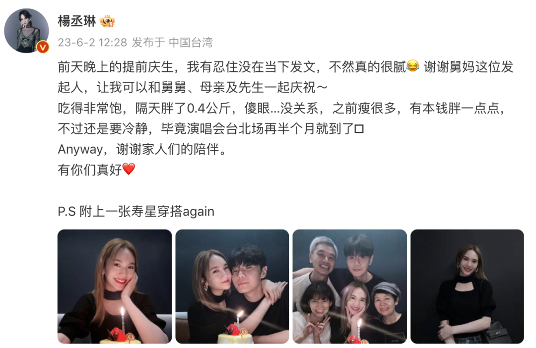 杨丞琳感谢舅妈组局,让自己得以和妈妈、老公以及舅舅一起庆生。她自称隔天胖了足足0.4公斤,但此前瘦了很多所以无伤大雅。众所周知,杨丞琳很喜欢健身,健身不就是为了在关键时候放开吃吗?