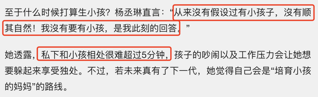 杨丞琳曾接受采访,表示和李荣浩并没有“顺其自然”,她不想要有小孩儿,她和小孩相处很难超过5分钟,觉得孩子太吵。