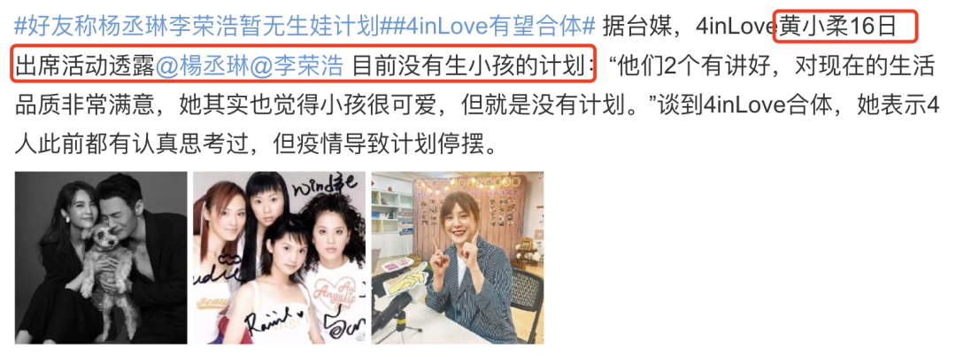 去年,杨丞琳的好友黄小柔也说杨丞琳和李荣浩没有生子计划。