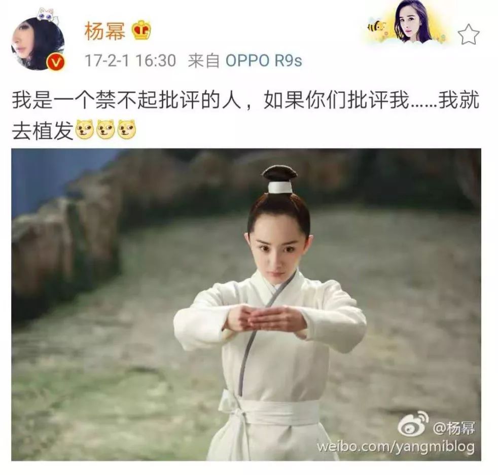 在《三生三世十里桃花》中,杨幂被批评发际线太高,她调侃自己要去植发。