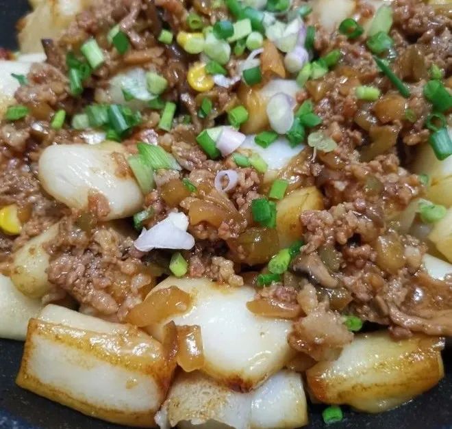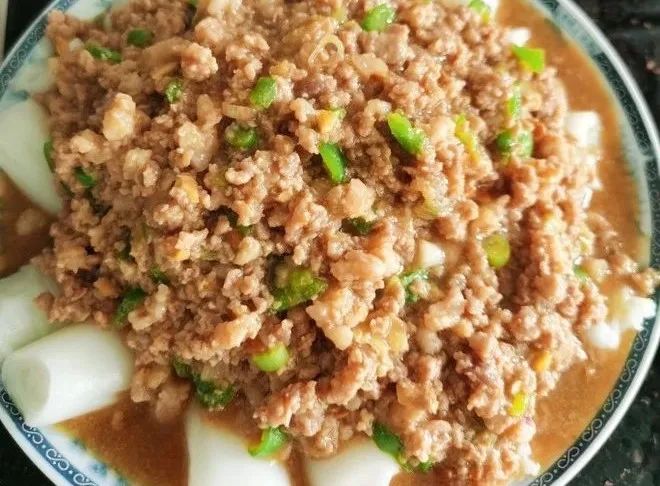 食材:猪肠粉1包、猪肉末100克、花生油、酱油、老抽、盐、糖、淀粉水5小勺、葱花1颗、乌江榨菜1包。