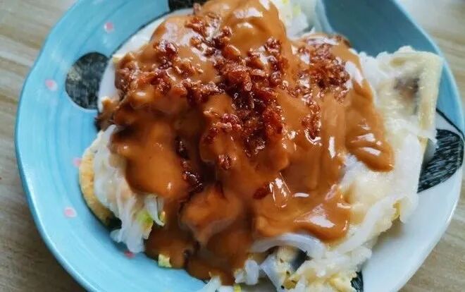 潮州肠粉有一个独到之处,就是喜欢用花生酱、沙茶酱、蚝油和芝麻油的搭配,看上去好像很腻,其实吃起来口感很好。