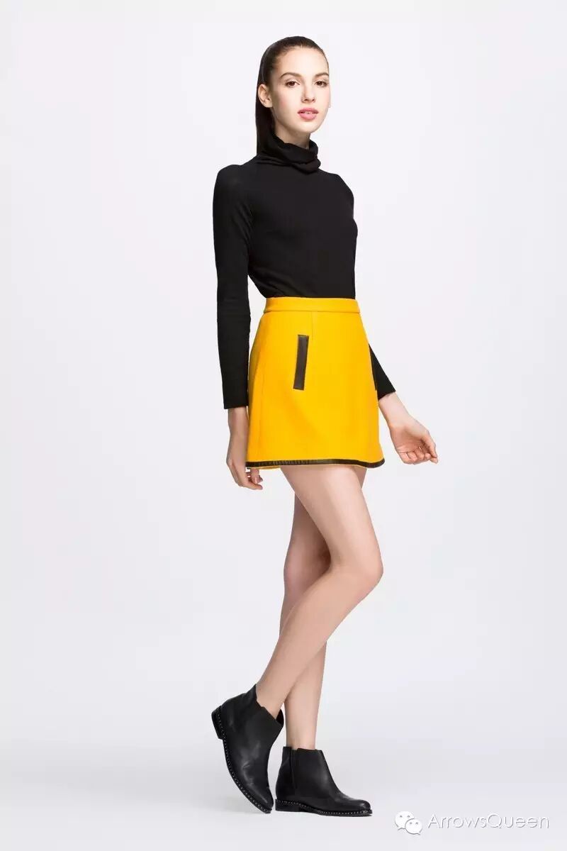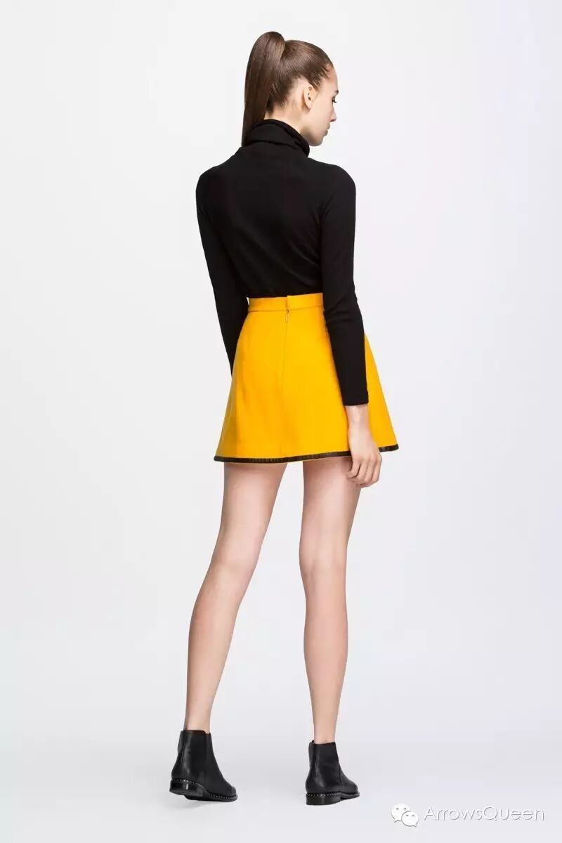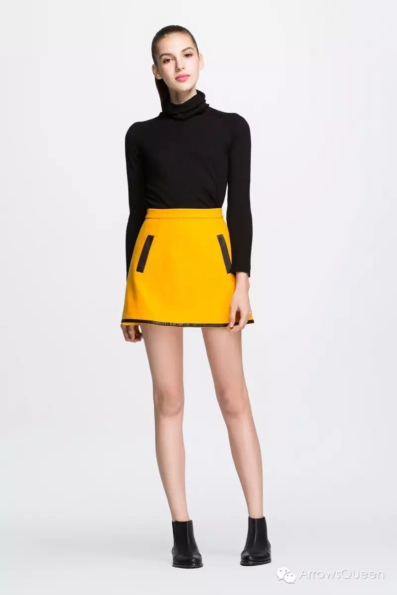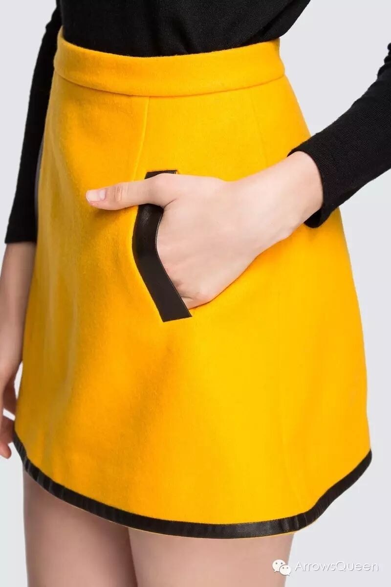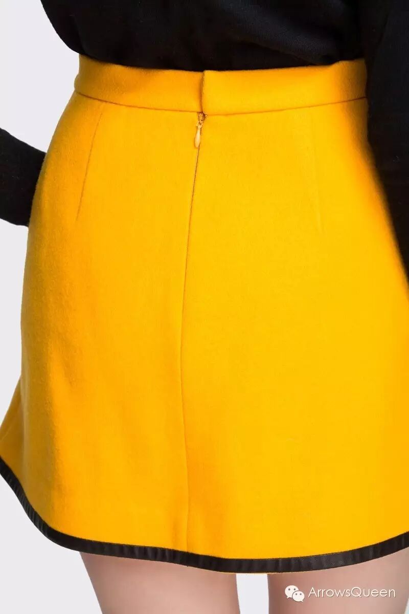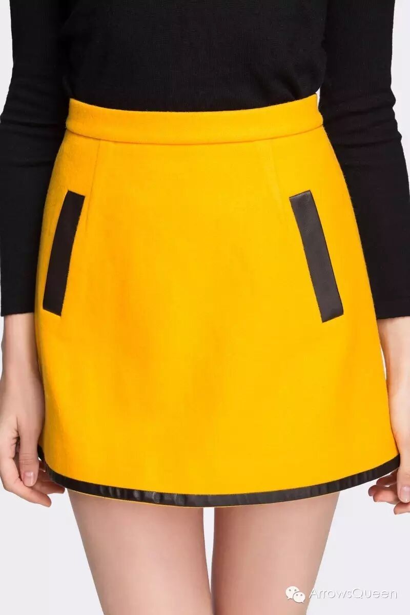 明黄色A字形短裙,A字形的立体剪裁完美的修饰了腿型,时髦性感显而易见,搭配一件纯色的高领针织衫,优雅又有气场,明亮的黄色绝对又是春季“抖骚”的最佳选择。