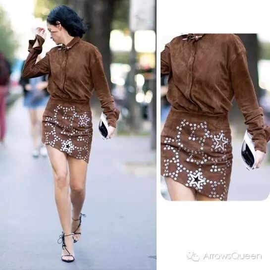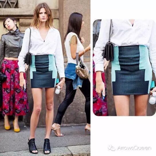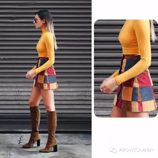 复古摩登的少女打扮没有比麂皮和A字短裙更适合了,多色的接拼其实配什么上衣都能吸睛;这样撞色的上衣喜欢个性突出的美人可以一试。