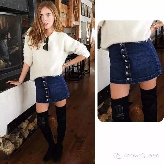 毛衣+牛仔A字裙+麂皮过膝长靴