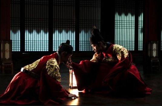 吕珍九在剧中同时饰演皇帝李宪和戏子河宣两个角色,单单之前公开的预告片里面就可以知道他把两个人物都很完美地消化了。从照片里面就可以感觉到时两个完全不同的人物,对吧?