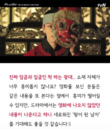 真的王,和假扮王的戏子...这样的素材本身难道不就叫人觉得很有意思么?看过电影的人,虽然再看会觉得减少了些乐趣,但是电视剧中会出现电影里没有的内容,所以期待崭新的《成为王的男人》也很不错呀。