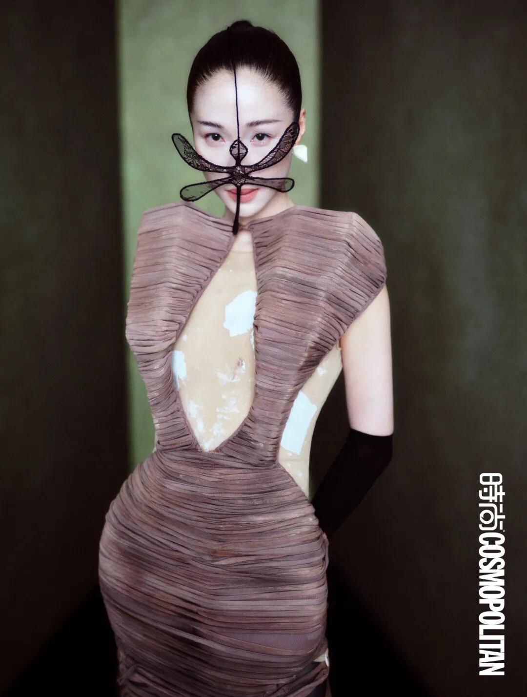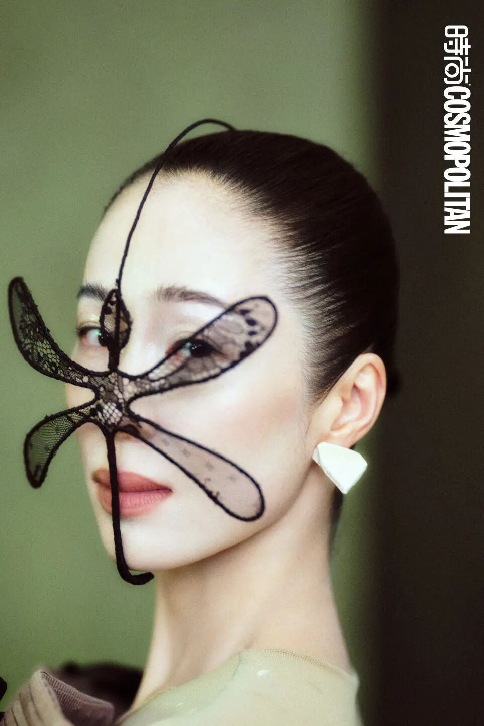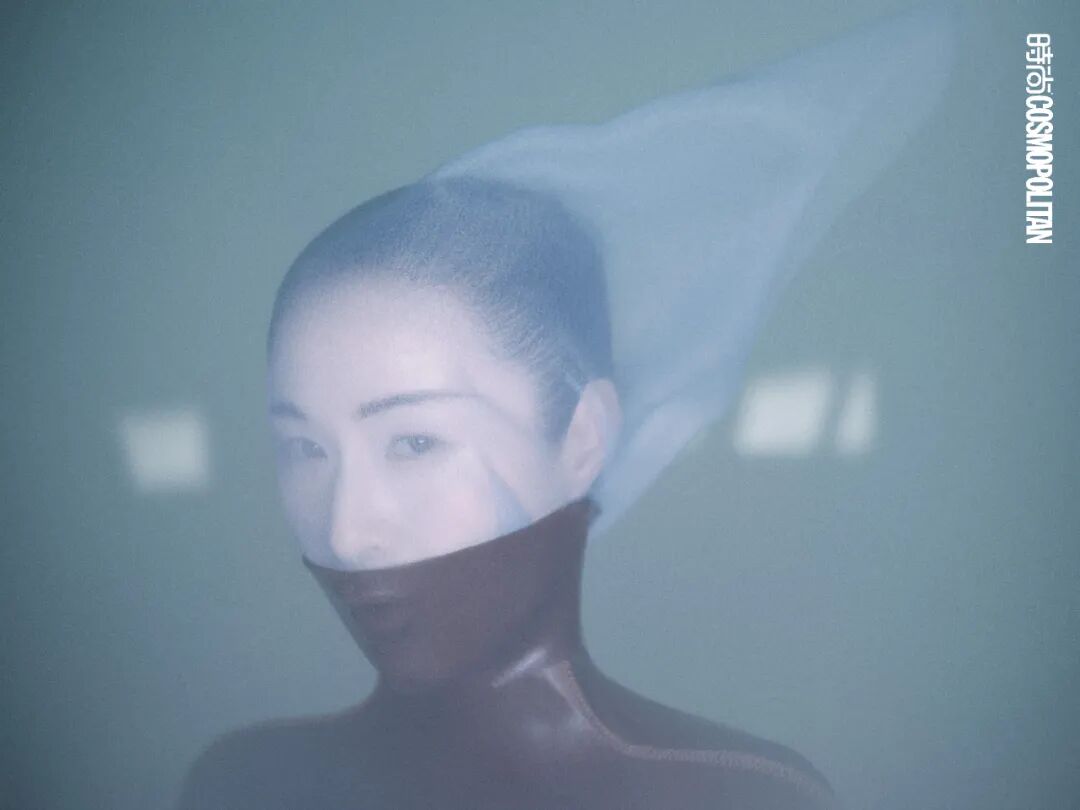 还有一个造型,我的脸是只露出了眼睛,然后头上有纱,嘴巴那里也蒙了一个皮衣,是一个很特别的造型。我记得当时拍的时候,我在那层薄纱里面,其实是有流泪的,是很情绪的一种表达,因为这些服装造型给了你一个充分的氛围诉说感去代入。你可以想象成他是你的一个角色,你也可以想象成这些蒙住你的脸的,也许是很多不同的声音——它给你一种窒息感,它让你无法去辩解,你只能在一层纱后面用眼睛去看这个世界。我觉得它其实也蛮像我过去的一些角色的,有非常多的无奈与挣扎,也很像我自己。