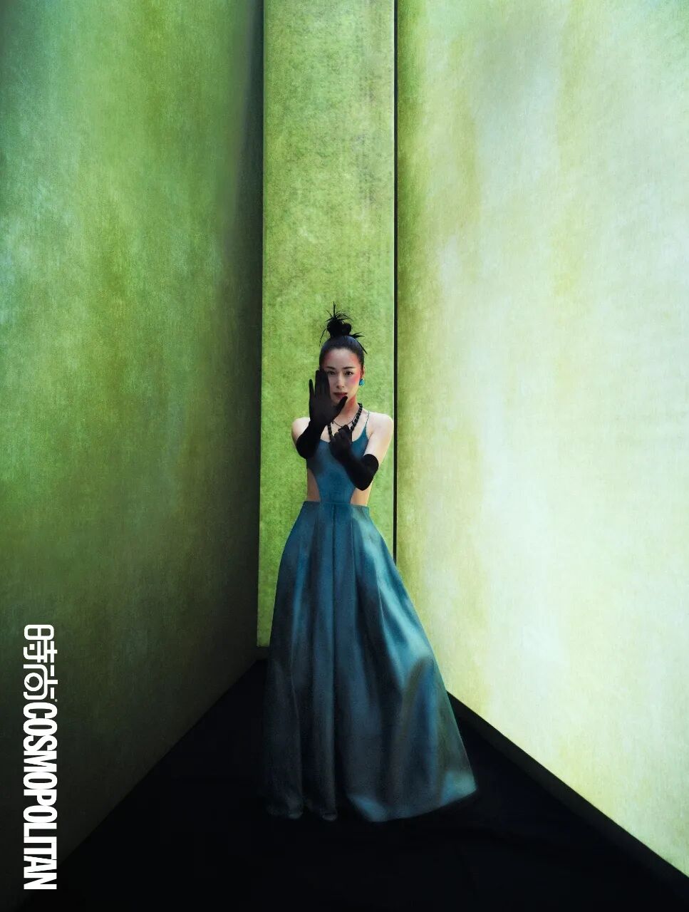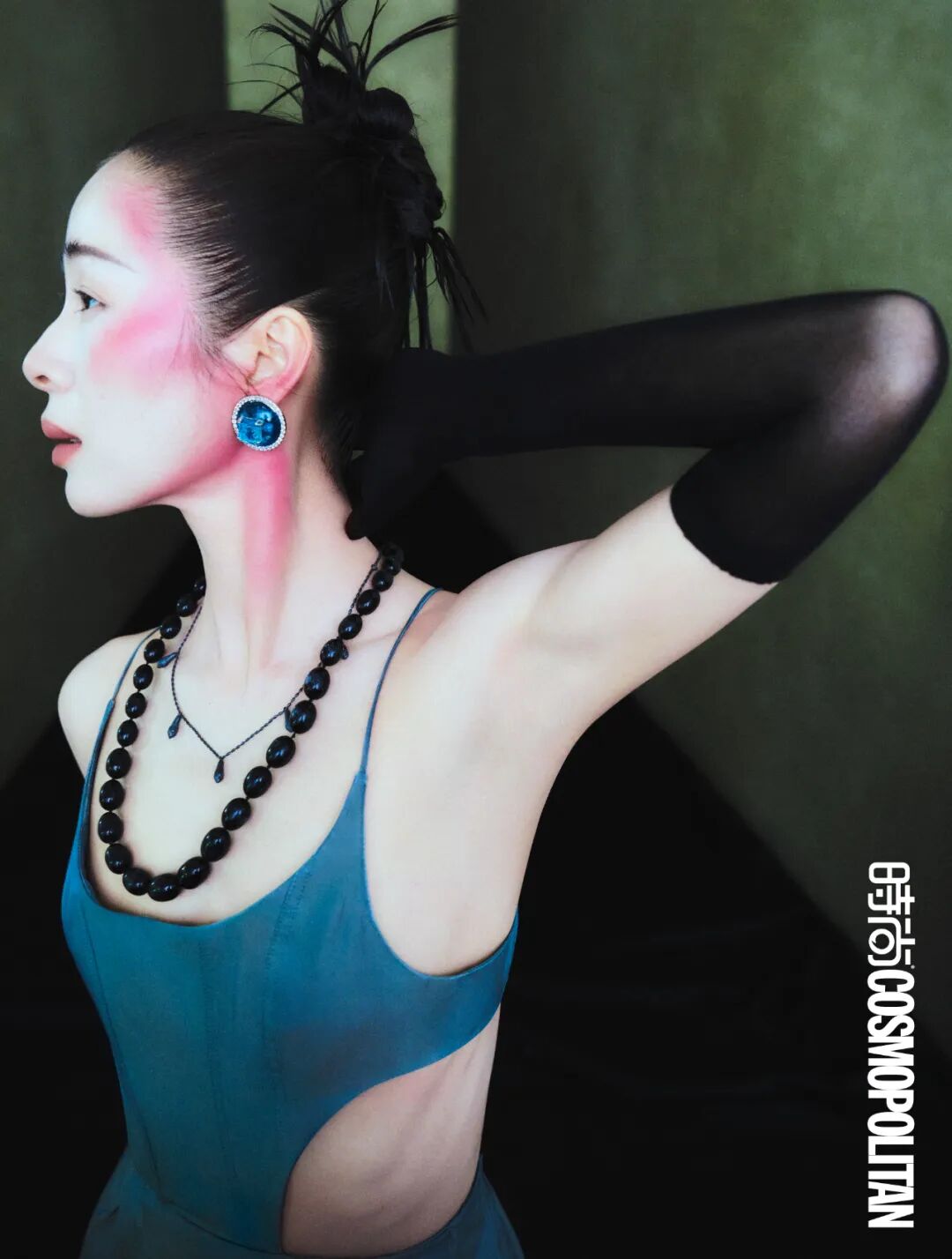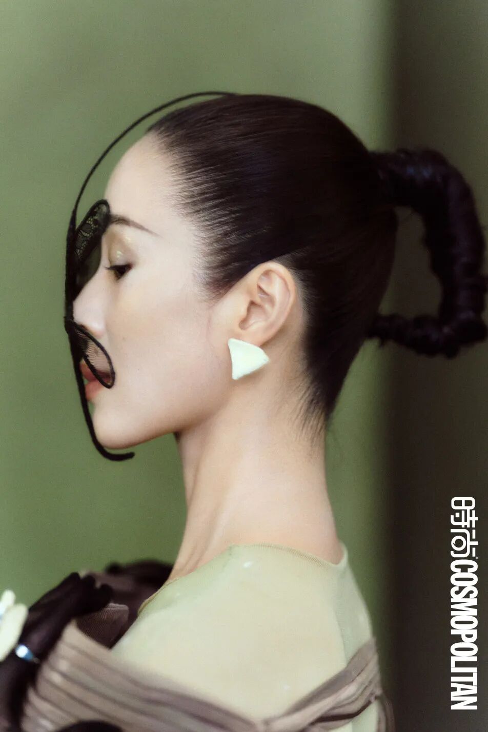 还有一个造型,我的脸是只露出了眼睛,然后头上有纱,嘴巴那里也蒙了一个皮衣,是一个很特别的造型。我记得当时拍的时候,我在那层薄纱里面,其实是有流泪的,是很情绪的一种表达,因为这些服装造型给了你一个充分的氛围诉说感去代入。你可以想象成他是你的一个角色,你也可以想象成这些蒙住你的脸的,也许是很多不同的声音——它给你一种窒息感,它让你无法去辩解,你只能在一层纱后面用眼睛去看这个世界。我觉得它其实也蛮像我过去的一些角色的,有非常多的无奈与挣扎,也很像我自己。