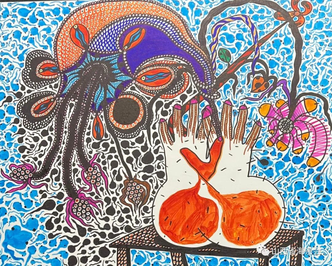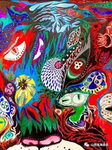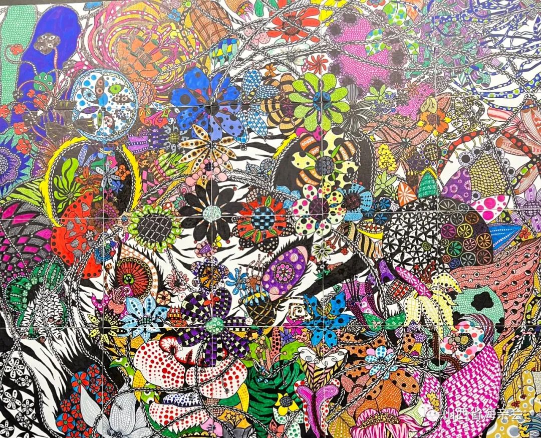 今年正逢农历壬寅年——虎年,因此在《花虎》系列画前,总是有人拍照留念。《花虎》系列一共有三幅。第一幅最为震撼:一只白色条纹的老虎隐秘在斑斓的花丛和枝桠之间。那些大红的、紫罗兰的、浅蓝的、明黄的、淡粉的、橘色的、翠绿的、黑的、灰的……,各色各样的花朵、花瓣、树叶、枝蔓、藤条,或舒展,或卷曲,或缠绕,或攀援,或交织,或依偎,你中有我,我中有他;还是大胆的撞色,还是细腻的笔触,把一只猛虎隐藏在一个罕见的“异彩空间”,让人少了几分对虎的惧怕,多了几分对花喜爱。《花虎》的第二幅和第三幅画的是虎的局部,同样的五彩缤纷,同样的耐人寻味,同样的抽象隐秘。参观者必须仔细地看,认真地辨,方能看清楚那虎的眼睛、耳朵、鼻子和黑白色的条纹。《花虎》,真是名副其实!艺术家通过这些画,表达出了自己的想法:“隐秘在丛林的猛兽像是掌握神秘世界的权力之柄,美丽又极端危险。对于国人,老虎是智、勇、力的象征。对于我来说,我的恐惧和希望接有魅力的植物和危险的老虎倾泻出来,是我本能地要它们成为我的视觉符号”。同时,艺术家也试图通过作品告诉观众,如果想象力的种子已经在你的内心植根,那么各种平凡的事物也会变得神奇并富有魅力。