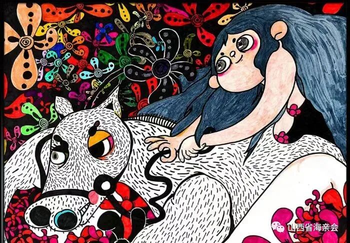 走过《花虎》系列,便是《小女孩》系列。《小女孩》系列实际上是艺术家自己的表达。王晰告诉我们,她五岁开始习画,大学在北京电影学院学习电影动画,后来又到了法国,在普罗旺斯土伦美术学院学习。《小女孩》系列一共14幅画,用色彩和图形诠释了艺术家成长的心路历程。女孩代表了她的自由,她对自然的敬畏和对创造的敬畏。艺术家是这样说的:“这个小女孩已经画了14年,她是我心中的自己。从中国到法国再到中国,就这么断断续续地把她画到了现在。今天我的女孩该说什么呢?近年来关于女性的话题,“平权”二字频繁出现。我看过性解放后的欧洲,了解欧洲男性女性的地位和状态。两种文化的洗礼中,我曾经摇摆了很久。那些硬计划:读书、嫁人、工作,也被无数次打碎再重组,原来生活并不光有计划。今天,传统男权社会下被推向经济、精神双独立的中国女性们,在”依靠“和”独立“的碰撞下越来越强,而我的女孩就是在讲那些烂漫的碰撞”。王晰用鲜艳的色彩、抽象的花卉、生物具象演绎了自己对生命、生活的认识。女性如花的隐喻贯穿于作品始终,大量的自然意向和元素与艺术家的女性意识产生了共鸣。