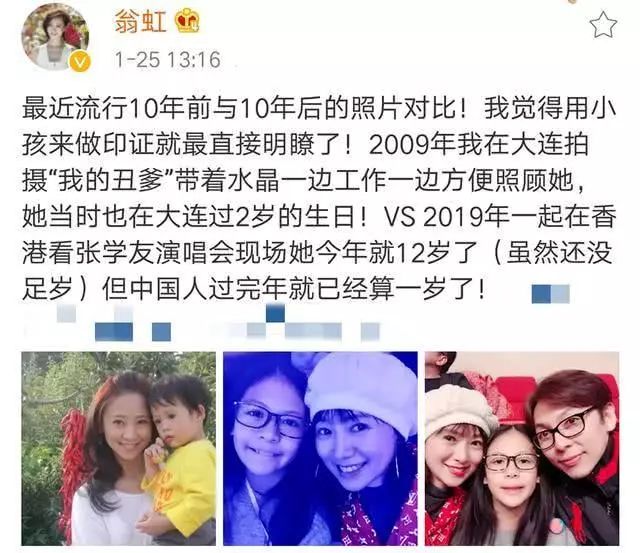 自从进入到2019年以后,网络上便流行起来晒自己2009年和2019年的对比照,1月25日,翁虹也分享了一波,她说道:我觉得用小孩来印证最直接明了!