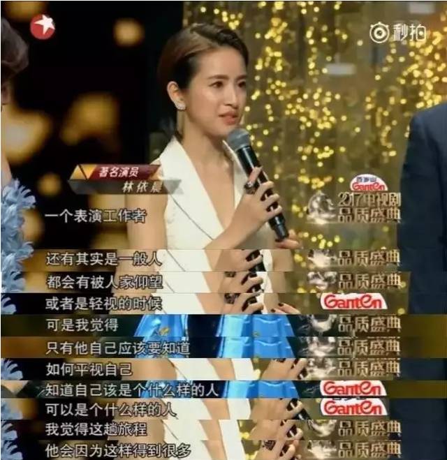 前阵子的国剧盛典中,林依晨又为即将出国留学的胡歌送上了赠言:“一个表演工作者,还有其实是一般人,都会有被人家仰望或者是轻视的时候。可是我觉得,只有他自己应该要知道,如何平视自己,知道自己该是一个什么样的人,可以是个什么样的人。我觉得这趟旅程,她会因为这样得到很多,然后开心玩吧!”