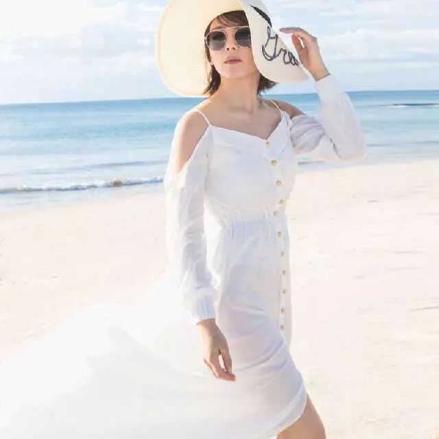 此款裙子恰好到大腿,身体娇小的美男不必担忧会太长,收腰设想,美体修身显瘦,前短后长的样式更有层次感,显高显腿长,海边度假时海风吹拂着裙子,甚是仙美。