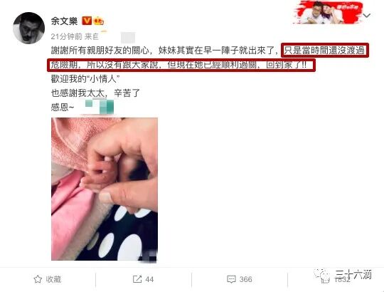 不过好在小宝宝非常的勇敢和坚强,如今已经平安出院了。文末,王棠云感谢了医生以及护理团队,最最重要的是,感谢了一直给她力量的老公余文乐。
