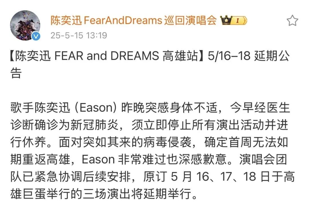 5月15日,香港歌手陈奕迅,又被确诊为肺炎,推迟台湾演出活动静养身体。
