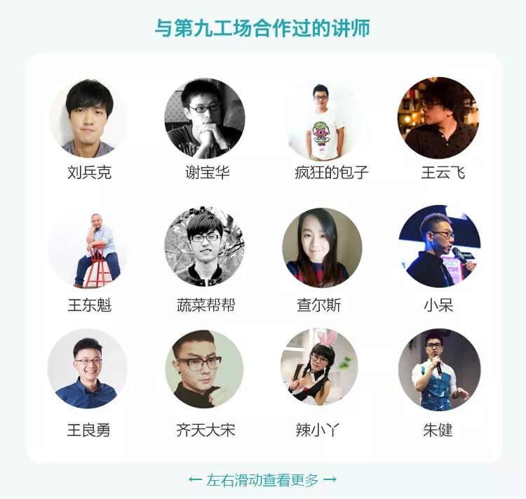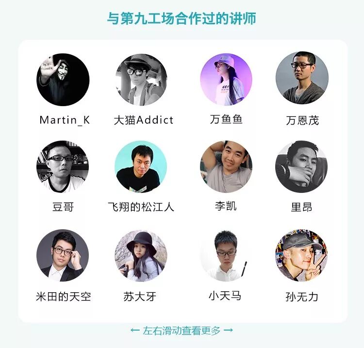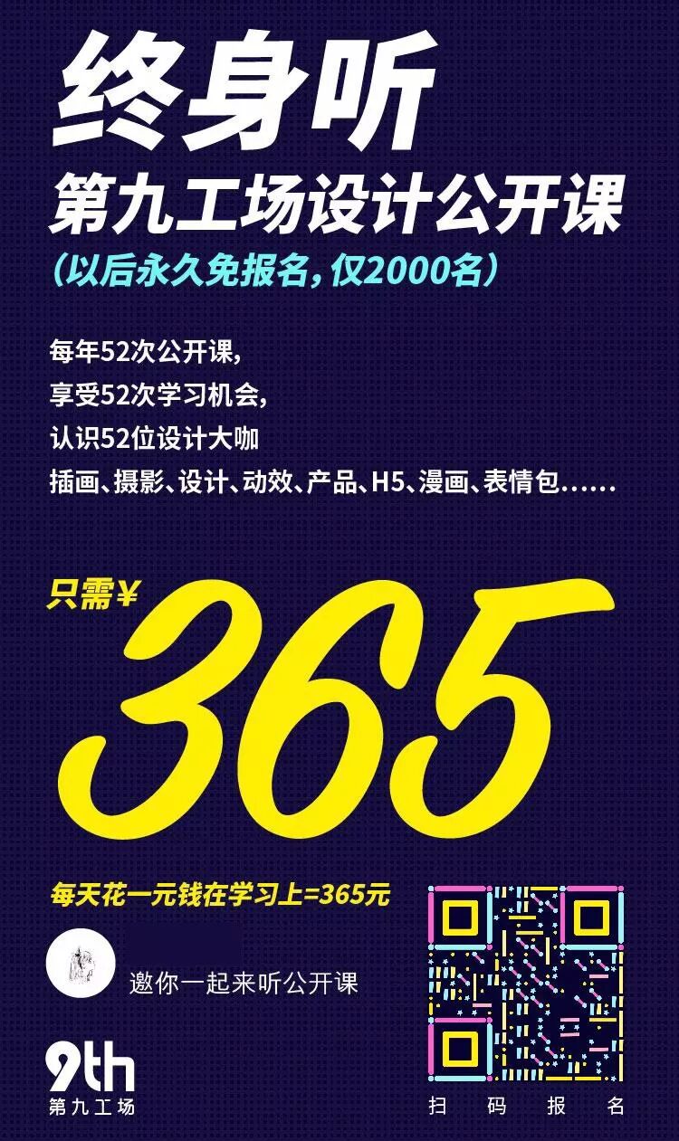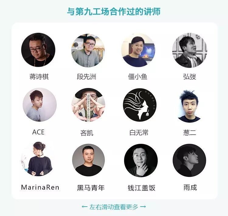 自2015年11月7日创办以来,第九工场邀请过303位牛X的创意人士,在线分享经历、创作心得以及干货技巧。三年里开展过84次设计公开课,报名听课人数总计4.5万人,分享内容涵盖了插画、摄影、设计、动效、产品、H5、漫画、表情包……其中有这些设计界大咖,你一定认识他们:
