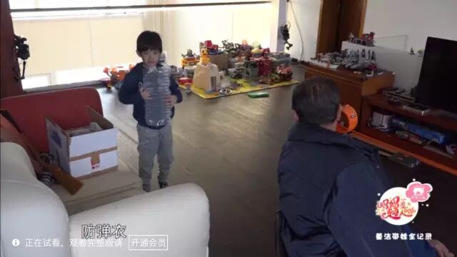 平日里特别天真烂漫,经常自己跟自己玩,比如说把快递里的塑料泡沫拿出来,装防弹衣: