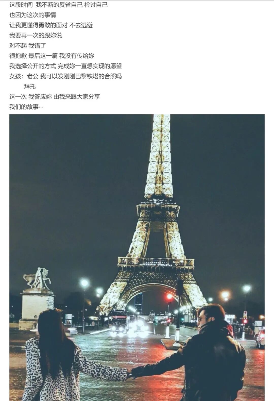 “老公,我可以发刚刚巴黎铁塔的合照吗?拜托~”