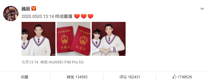 在这个幸福的日子,我们早就做好了吃狗粮的准备。13点14分,魏晨晒出结婚照宣布结婚喜讯,配文写道