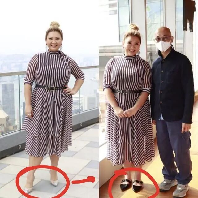 活动中郑欣宜也是特意踩着双优雅高跟鞋参加活动,可是粗壮的小腿和肉嘟嘟的脚丫把银色高跟鞋衬托得特别娇小,看着都挤得慌。最后,可能因为体重压力,不得不把高跟鞋换成了平底鞋,终于感觉压力小了不少呢。