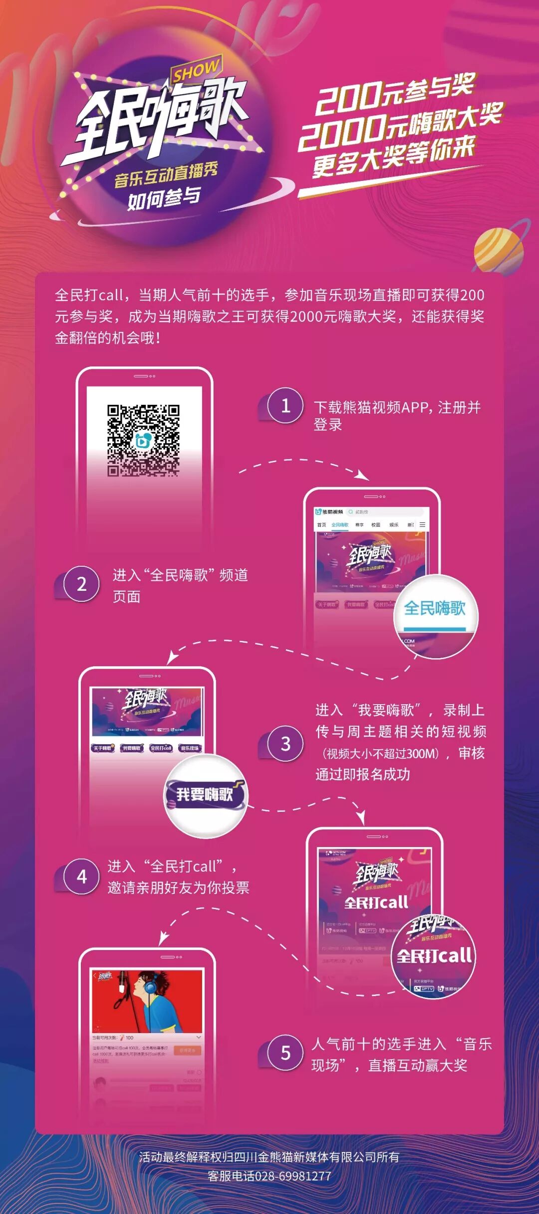 用户在各大应用市场下载熊猫视频 APP,注册后即可在《全民嗨歌》节目专区的“我要嗨歌”,一键上传短视频,审核通过即为报名成功。