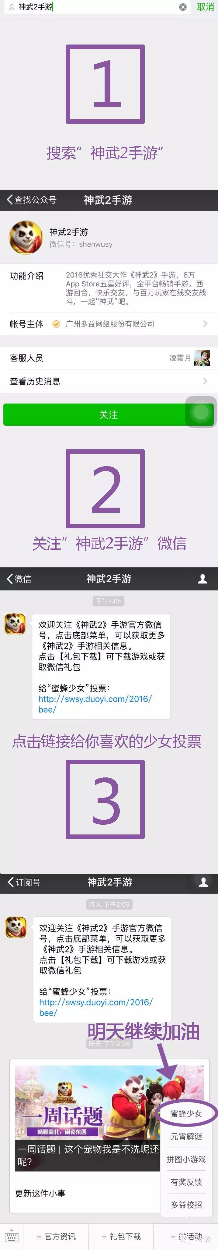 《神武2》手游,《蜜蜂少女队》官方指定游戏!粉丝们可以通过关注神武2手游微信为自己喜欢的少女或者教头投票!《神武2》手游玩法丰富,系统创新,便捷的即时语聊、智能离线保护、自动组队等功能一定让你爱不释手!还在等什么呢?关注神武2手游微信为蜜蜂少女队投票吧!