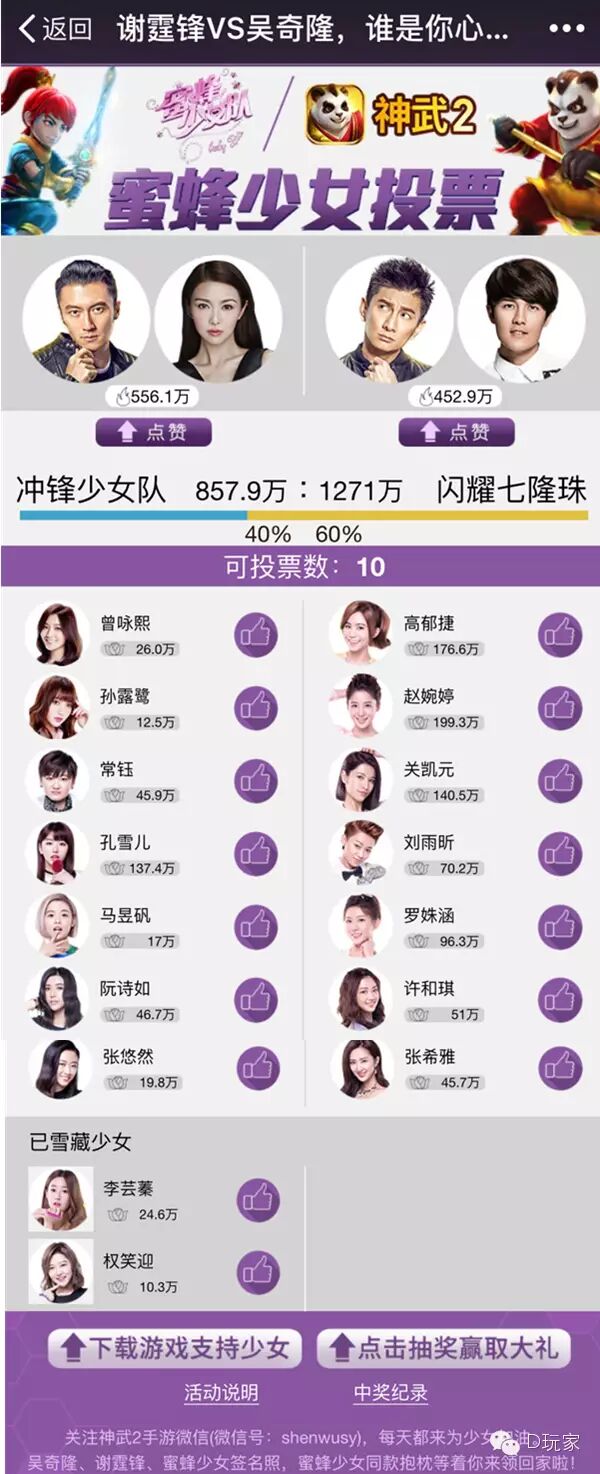 神武2手游微信 上的蜜蜂少女队的官方投票页面人气爆棚,目前总的人气值已达到千万级别,可以看出粉丝们为了自己的偶像也是不留余力。