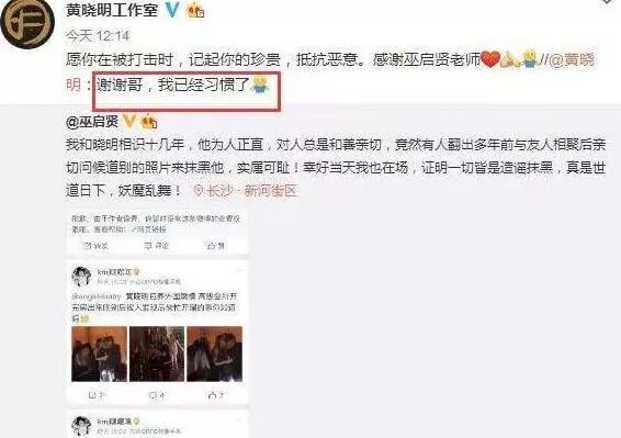 很快巫启贤也是在微博中为了黄晓明辟谣,称自己跟黄晓明认识这么久了,黄晓明是什么样的人,自己心里也很清楚,并不是外界所说的那种人呢,并且表示,这些知识有的一些人在恶意绯闻自己,这样做事一件非常可耻的事情你个,巫启贤也证明了自己当天也在场,自己完全可以证明黄晓明的清白,很快黄晓明本人也是做出了回应称:谢谢哥,我已经习惯了!