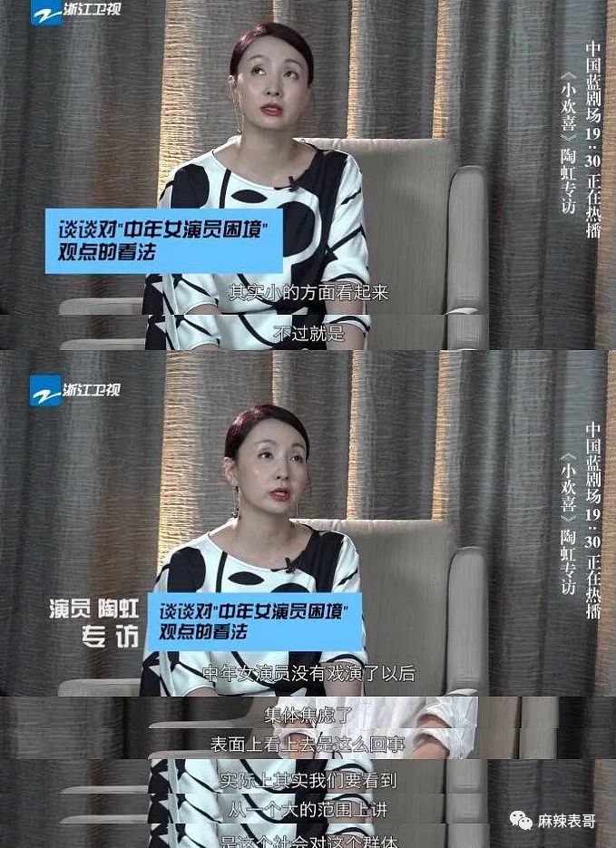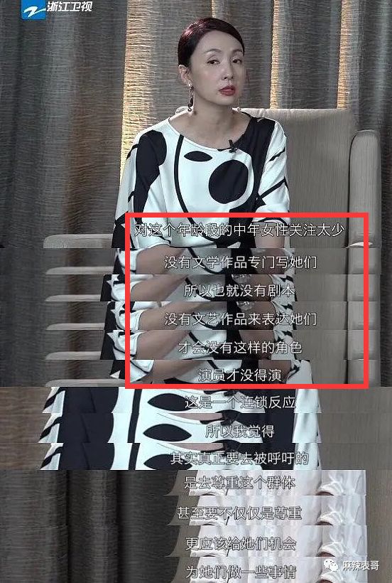 她曾谈过中年女演员的困境,从小的方面来看,是中年女演员没戏演了,集体焦虑了。
