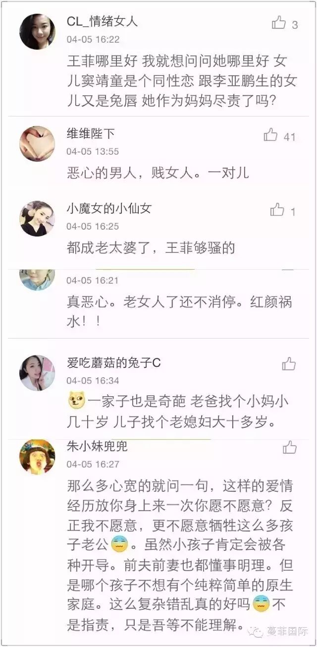 所以我常说中国“直男癌”的重灾区其实是在女性群体里,下面是昨天王菲和谢霆锋被拍到牵手跑步之后微博评论里我随便截的图↓