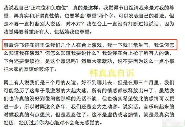 韩真真也表示对许飞的行为很不理解,台上不停地打断别人说话,极不尊重别人,甚至还将大家真情实感的情绪说成是在演戏,因为一点小事破坏了大家的友谊。