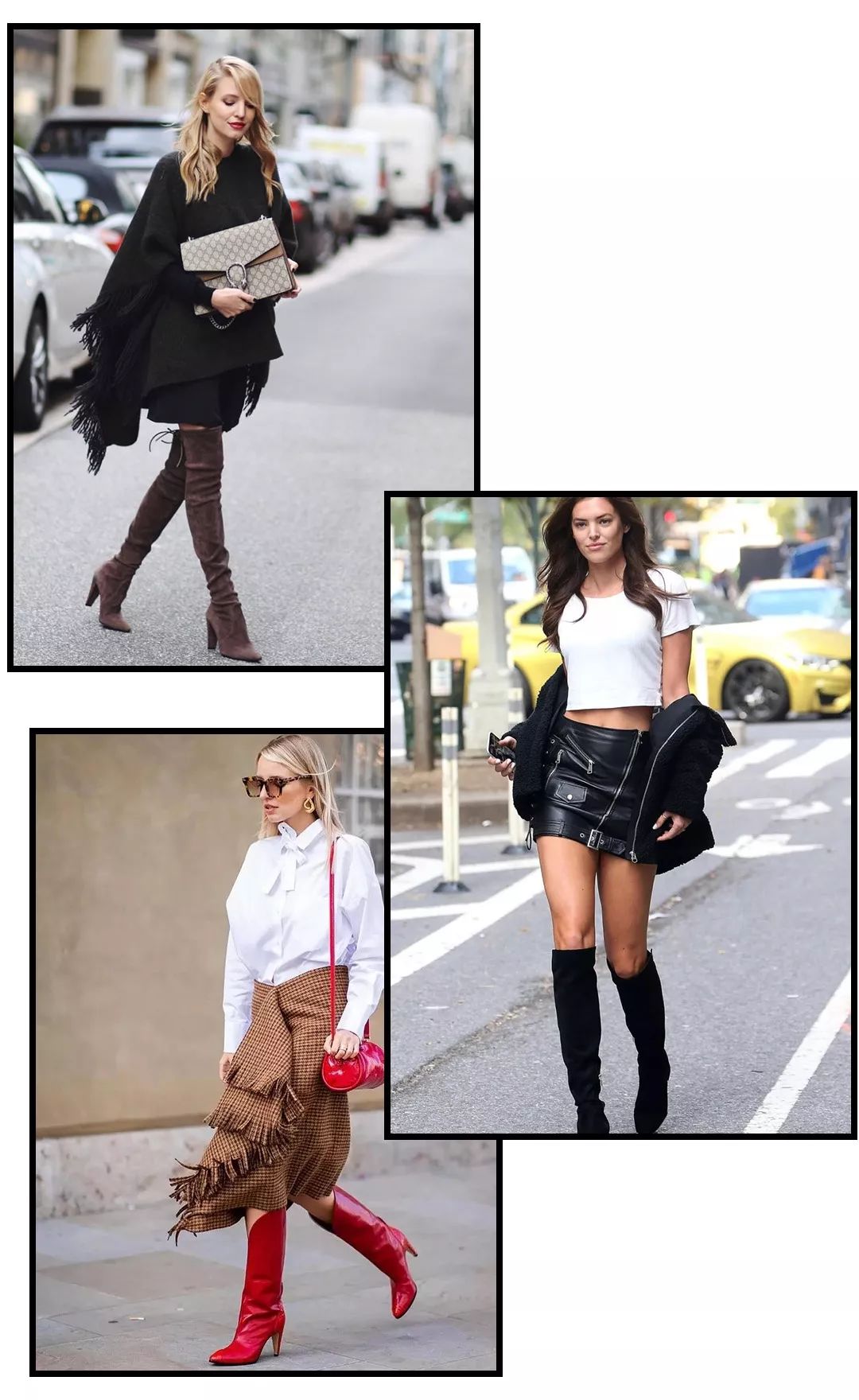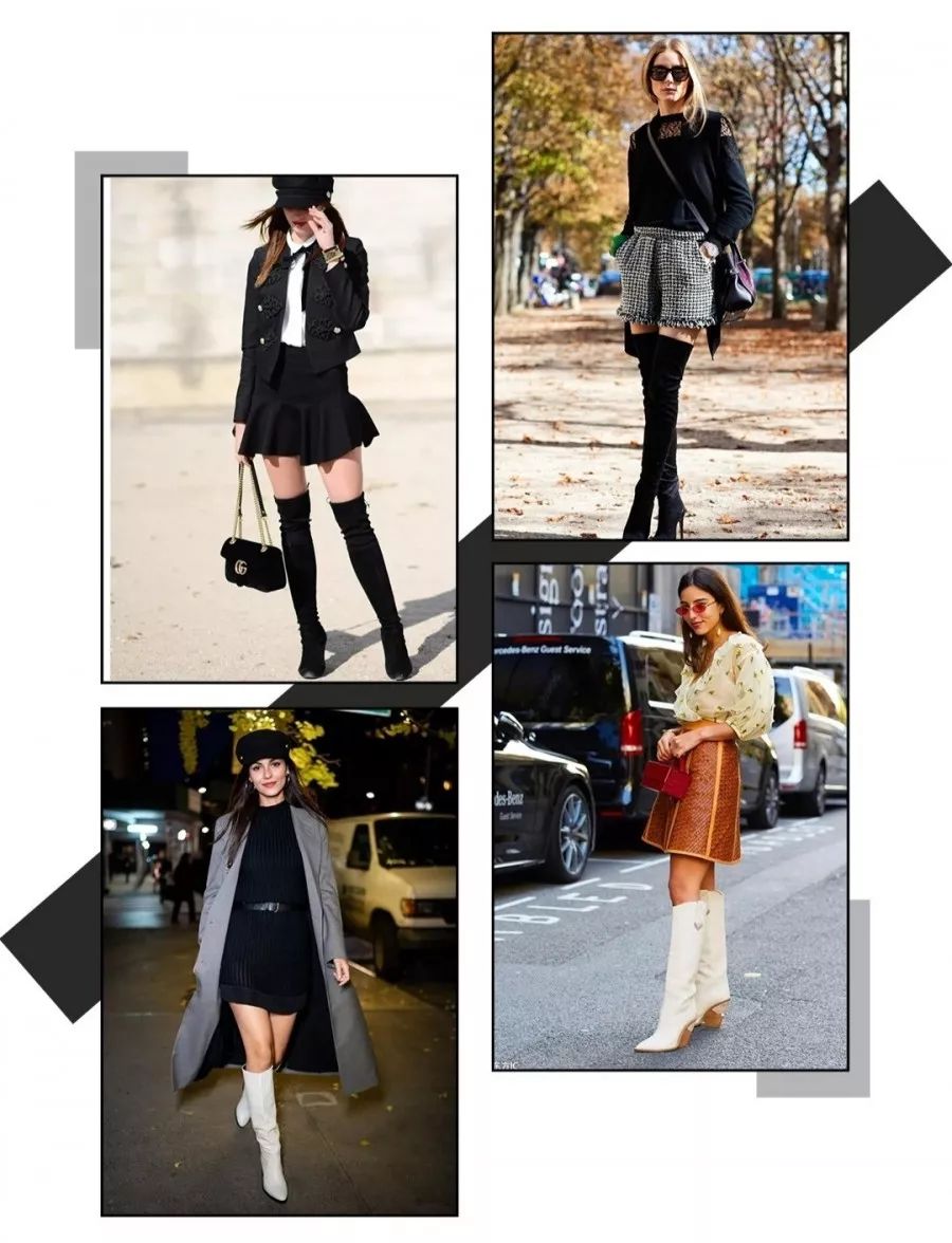 搭配短裙或者短裤的时候,裙子和靴子之间记得保留一点腿部空间,会让双腿看起来更加的高挑轻盈,打造妥妥的大长腿▼