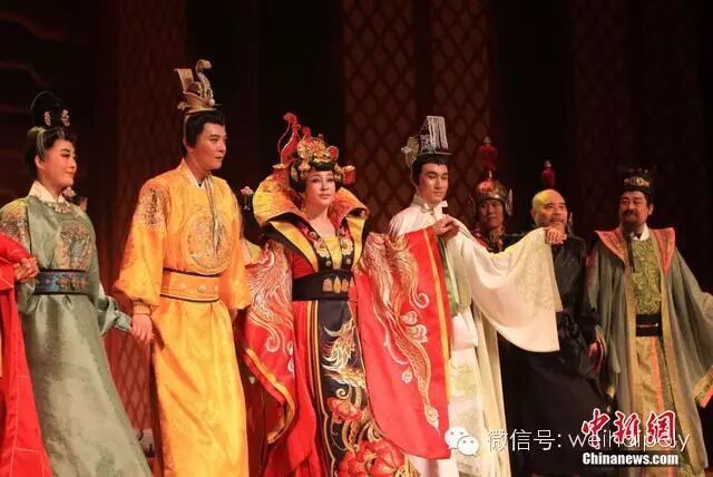 3月11日,刘晓庆(中)在加拿大多伦多巴西特剧场上演的大型话剧《武则天》中饰演武则天。当天,大型话剧《武则天》在多伦多上演。这部话剧由天津人民艺术剧院剧组演出、刘晓庆领衔。该剧以公元684年武则天垂帘改制、登基前夜为故事背景,讲述了武则天决心成为中国历史上第一位女皇帝的动机和心理过程。(来源:新华社)