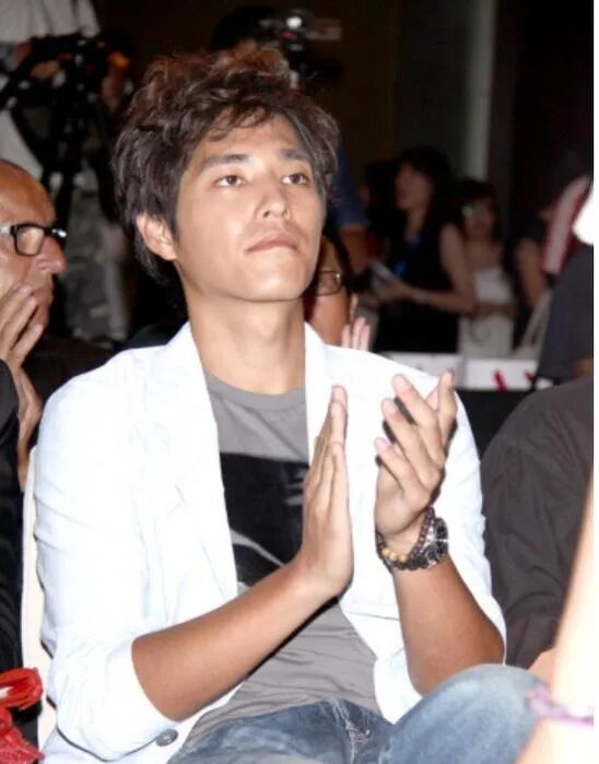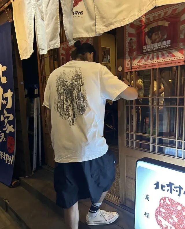 他身着简单的短袖 T 恤,搭配低裆短裤,一头长发扎成丸子形状,还戴着发箍,下巴上留着胡须,手腕上那串珠串更是为他增添了几分独特的气质。