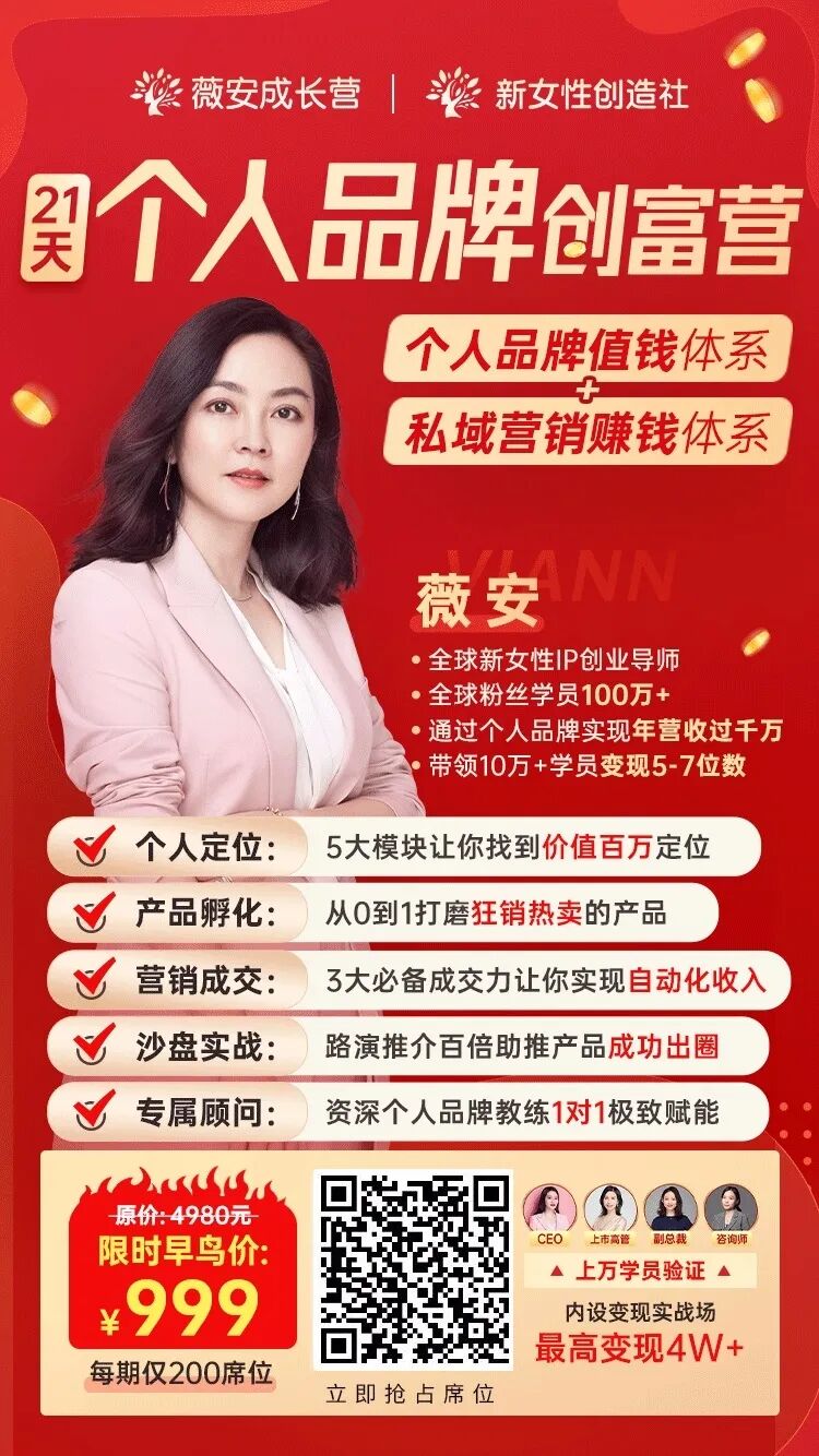 薇安Viann,二宝妈,前世界500强高管,掌管生意数10亿。G20二十国集团青年企业家联盟中国理事会理事,全球新女性IP创业导师,总裁演讲教练,营销实战专家,公众号“薇安说”创始人,全网学员粉丝百万。帮助数万学员实现5-7位数价值变现,畅销书《迭代》、《线上赚钱》作者,当当网最具影响力作家。